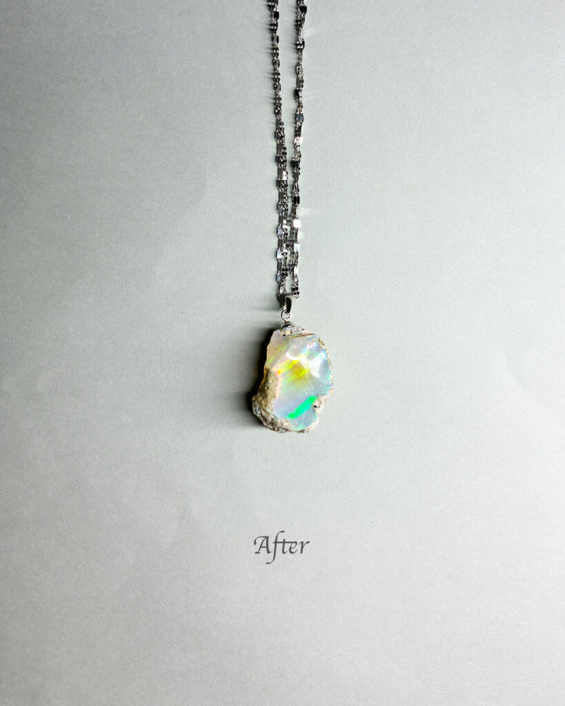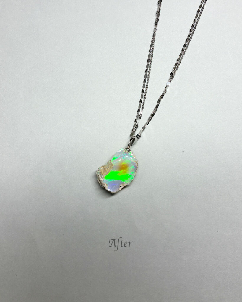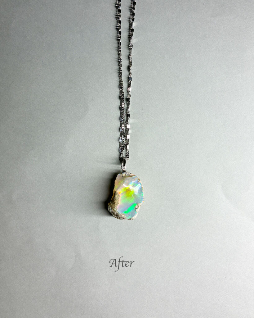今回はオパールに直接穴をあけて金具をつけ、ネックレスにしました。