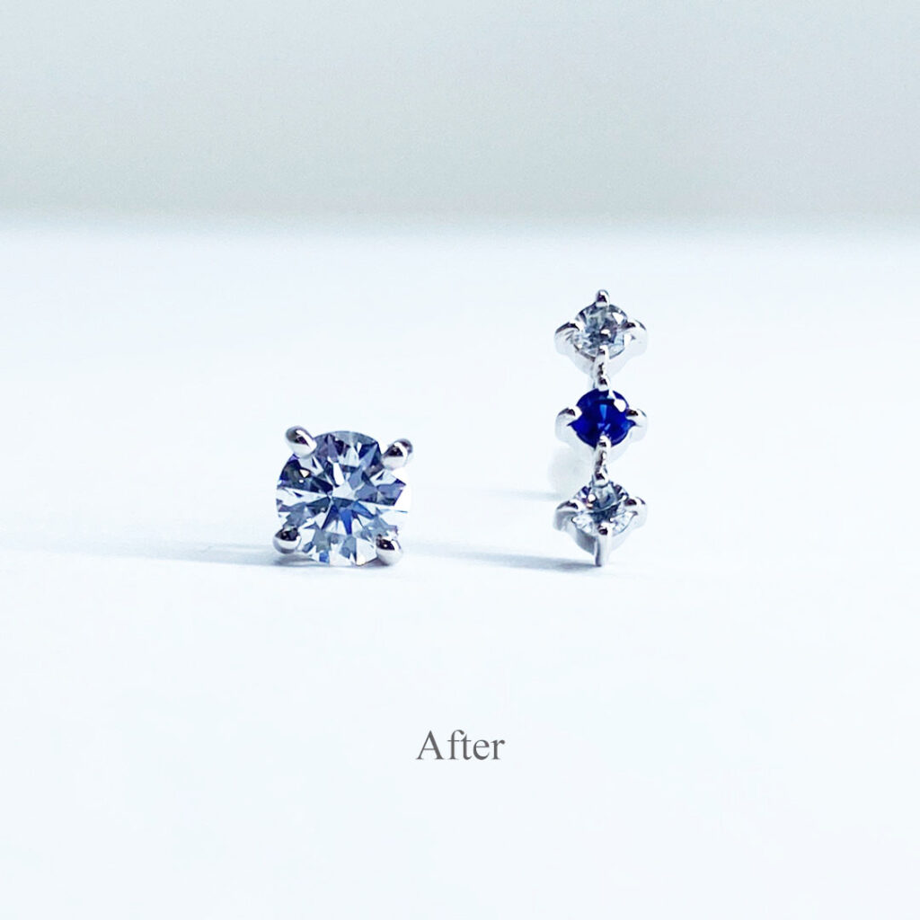 婚約指輪に使われていたダイアモンドを全て使用しましたが、After中央のブルーサファイアは指輪内側に留められていた石です。