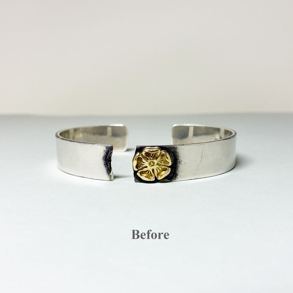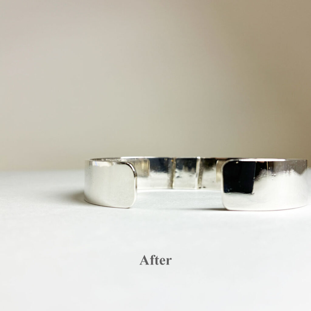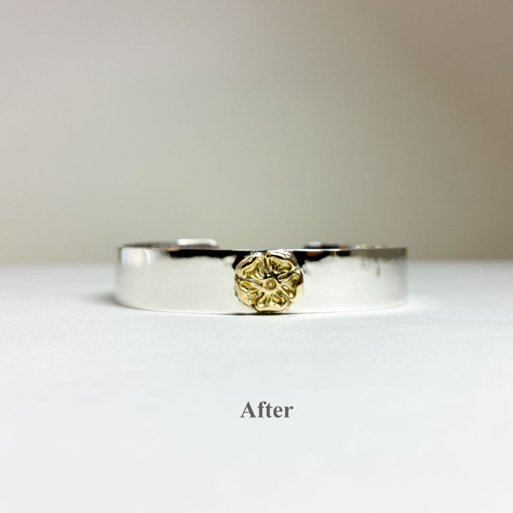 バングル裏側からシルバーの板を貼って補強し、全体を磨き上げて修理させていただきました。