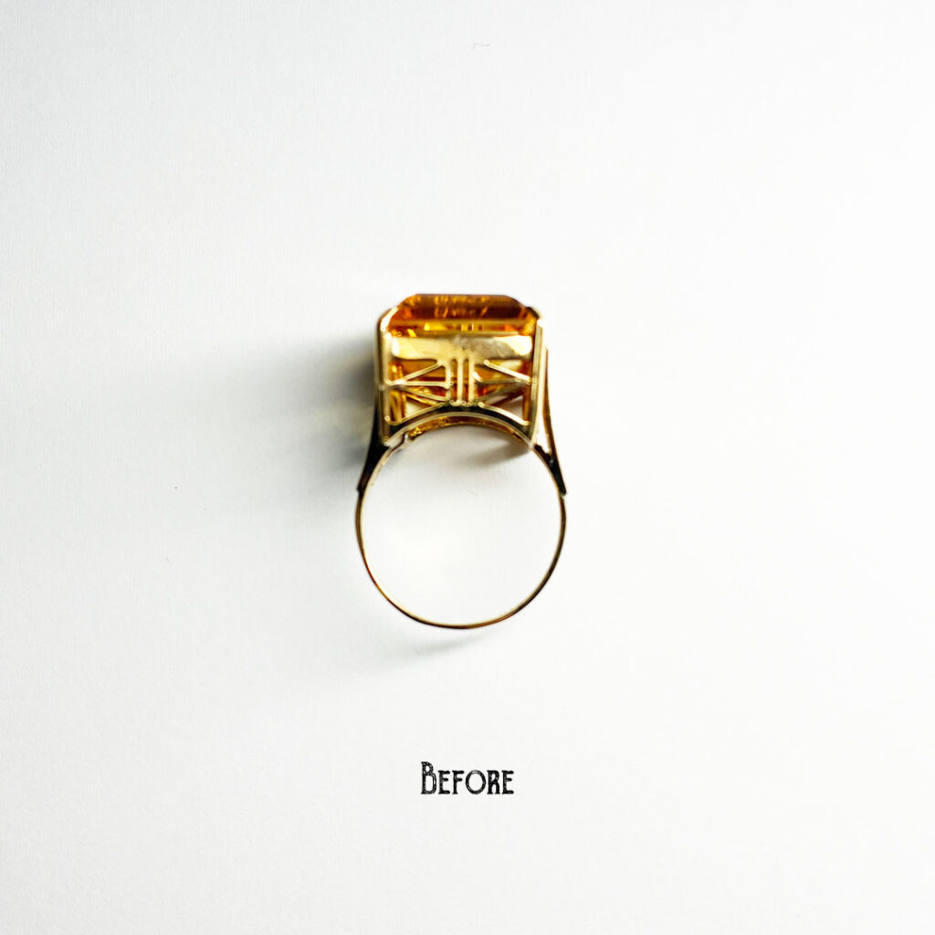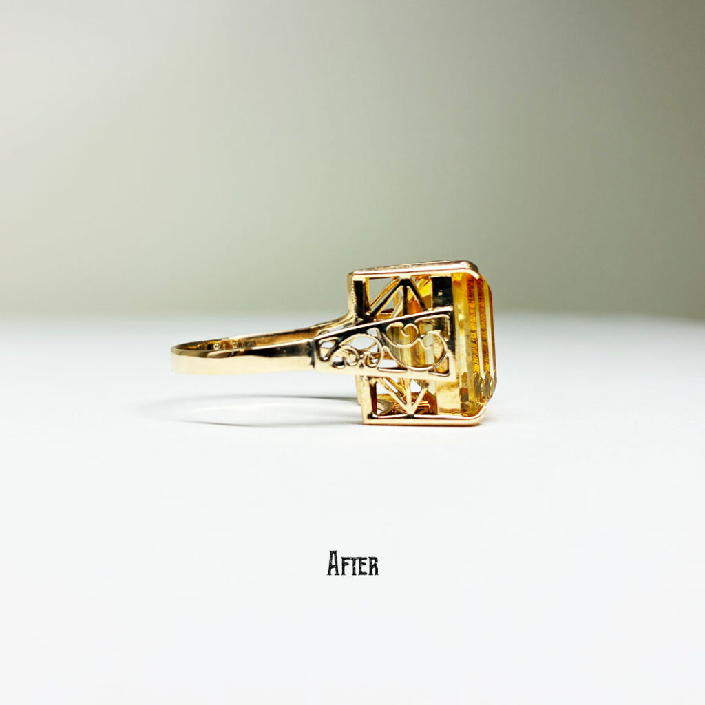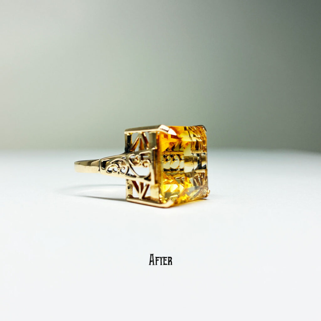 この石、透明度が高いのでサイドの透かし模様がくっきり透けて見えて綺麗ですね。うっとりします。中世ヨーロッパ時代ってこんなリングがたくさんあったのかなぁと思わせる豪奢なデザインですね。